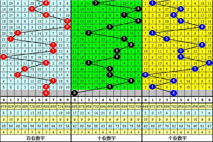 大中小分析:在组选0-9号码分布图中,前10期小号(0-2区段)出现9枚奖号,中号(3-6区段)出现12枚奖号,大号(7-9区段)出现9枚奖号,上期大号区域轮空,本期防大号转冷,预计7-9区段无号。