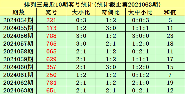 上期回顾:排列三第2024063期奖号为:651。奖号类型:组六,和值:12,奇偶比:2:1,跨度:5,大小比:2:1。