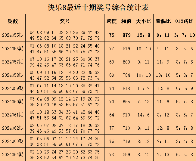 福彩快乐8第2024064期开出奖号:02 10 23 24 27 28 29 32 33 35 36 38 52 54 67 70 72 73 74 80,其中奖号跨度开出78,和值开出859,大小比开出8:12,奇偶比开出7:13,012路比开出6:6:8。