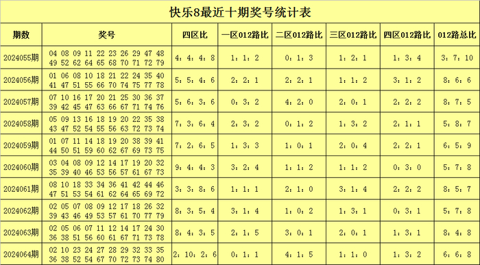 福彩快乐8第2024064期开奖回顾:02 10 23 24 27 28 29 32 33 35 36 38 52 54 67 70 72 73 74 80,其中奖号四区比为2:10:2:6,012路比为6:6:8,和值为859,跨度为78。