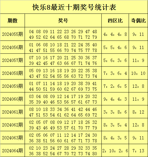 福彩快乐8第2024064期开奖回顾:02 10 23 24 27 28 29 32 33 35 36 38 52 54 67 70 72 73 74 80,其中奖号四区比为2:10:2:6,奇偶比为7:13。