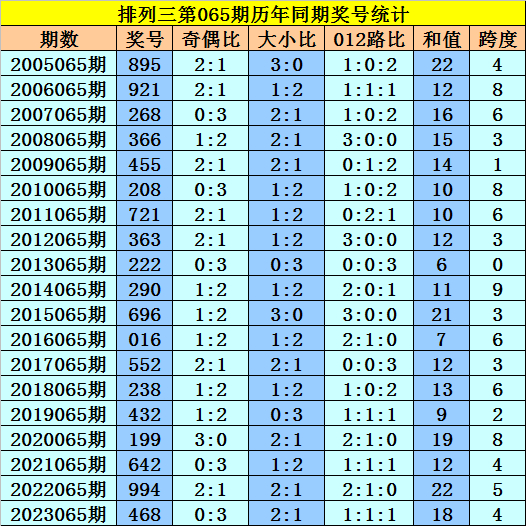本期为排列三第2024065期开奖,历史上排列三第065期已开出了19期奖号了: