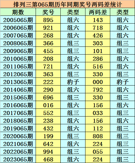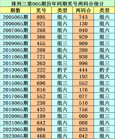 排列三从2004年开奖至今已开出6836期奖号了,其中第065期历史同期奖号出现19次,历年第065期分别开出号码:895、921、268、366、455、208、721、363、222、290、696、016、552、238、432、199、642、994、468。