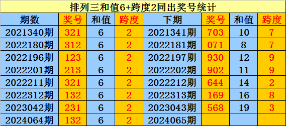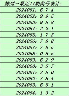 上期回顾:排列三第2024064期奖号:132。和值6,跨度2。