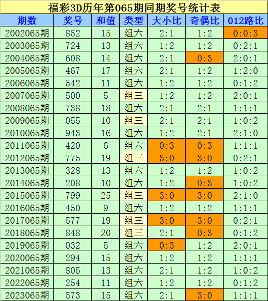 组选类型判断:在第065期历史同期开奖中,组六开出16次,组三开出6次,今年同期看好开出组六号码。