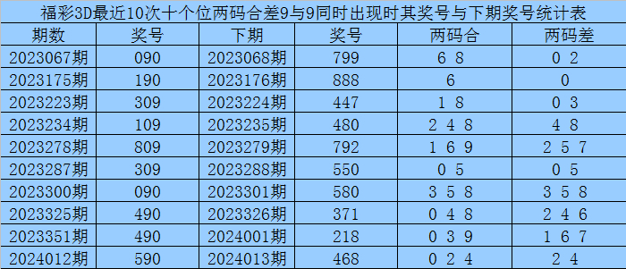 从以上统计可以看出,十个位两码合差9与9同时出现之后其下期两码合差表现最热的4个分别为:0246,本期十个位两码合差可以参考这四码中的数据。
