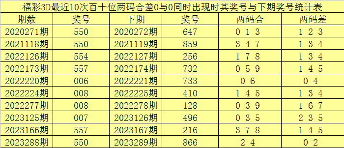 百十位合差分析:上期奖号百十位开出00组合,两码合为0,两码差为0,最近10次百十位两码合0与两码差0同时出现时,其奖号和下期奖号分别为: