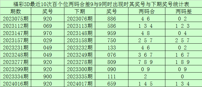 从以上统计可以看出,百个位两码合差9与9同时出现之后其下期两码合差表现最热的4个分别为:0124,本期百个位两码合差可以参考这四码中的数据。
