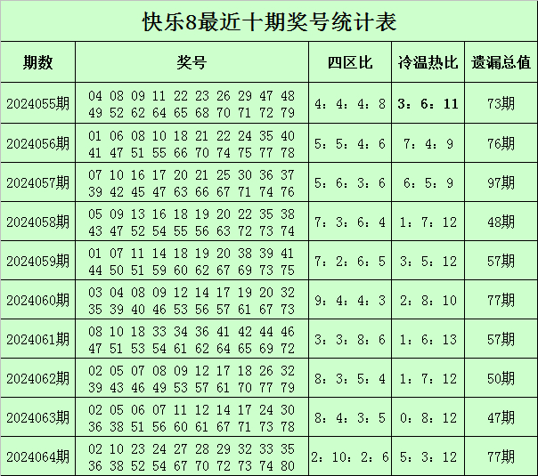 福彩快乐8第2024064期开奖回顾:02 10 23 24 27 28 29 32 33 35 36 38 52 54 67 70 72 73 74 80,其中奖号四区比为2:10:2:6,冷温热码比为5:3:12,遗漏总值为77。