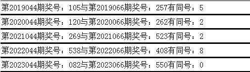 与前期历史同期奖号对比分析,在最近五年开奖中,第044期同期奖号与第066期同期奖号都出现了相同号码: