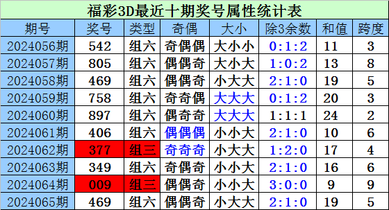 上期回顾:上期开奖奖号为469,类型:组六,偶偶奇,小大大,2:1:0,和值19,跨度5。