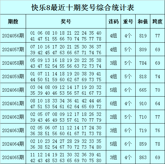 福彩快乐8第2024065期开出奖号:11 12 14 19 21 30 32 36 39 41 42 43 48 53 63 65 69 70 75 80,其中奖号和值为863,跨度为69,包含4个重号32、36、70、80,包含连码11 12、41 42 43、69 70。