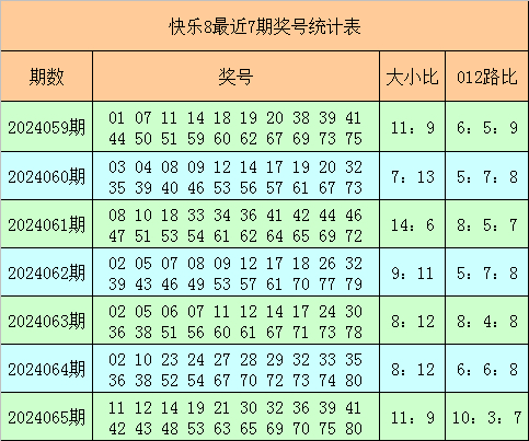 快乐8第2024065期奖号为:11 12 14 19 21 30 32 36 39 41 42 43 48 53 63 65 69 70 75 80,其中奖号012路比为10:3:7,大小比为11:9。