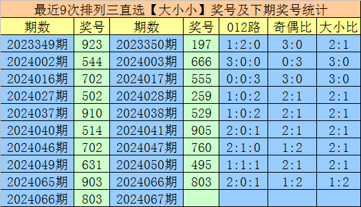 上期回顾:排列三第2024066期奖号为803,组六,大小比开出1:2,直选分布为:大小小。
