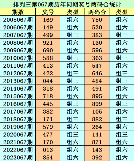 在排列三第067期历史同期开奖中,各号码两码差分别为:358、358、055、178、369、033、123、022、044、257、167、011、156、066、224、033、167、123、134;