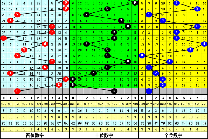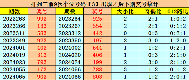个位前9次开出号码3时,该位下期奖号分别为:5-4-2-7-4-6-9-8-3,其中号码个数大小比是5:4,012路比是3:3:3,奇偶比是4:5。