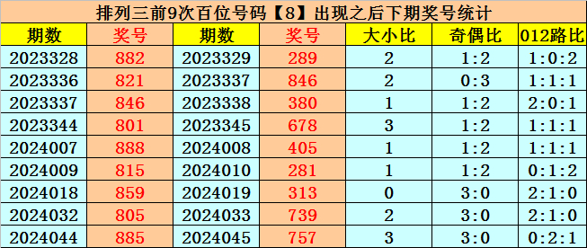 在百位前9次出现号码8之后,下期百位分别开出奖号:2-8-3-6-4-2-3-7-7,其中开出号码个数奇偶比是4:5,大小比是4:5,012路比是3:3:3。