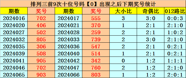 在十位前9次出现号码0后,其下期奖号分别开出:5-7-5-3-4-1-4-6-0,其中奖号个数奇偶比是5:4,大小比是4:5,012路比是3:4:2。