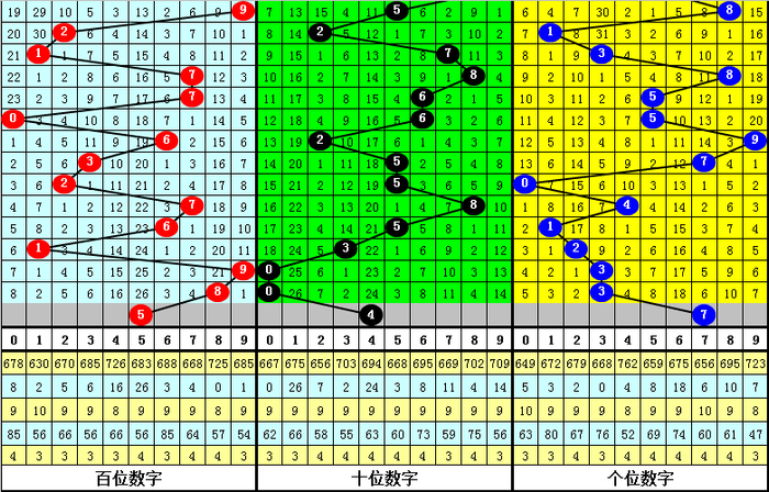十位分析:上期该位奖号为0,近10期该位奖号012路比为5:0:5,其中0路号码连续出现3次,本期十位放弃0路号码,预计出现1路号码,关注号码4。