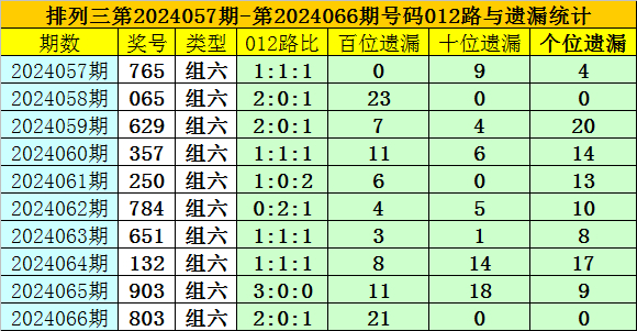 开奖回顾:排列三第2024066期奖号为:803,类型为组六,号码012路比为2:0:1,百十个位号码直选分别遗漏21期、0期和0期。