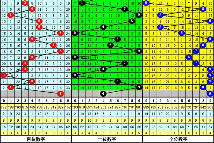 百个位合:前10期百个位两码合开出:3、3、5、5、0、0、2、9、3、9,其中百个位两码合012路比为7:0:3,奇偶比为7:3,本期看好百个位两码合开出1路号,参考两码合1、4、7。