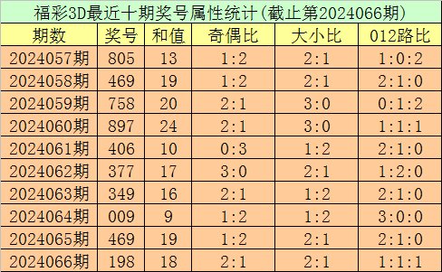 开奖回顾:第2024066期福彩3D奖号为198。奖号形态为组六,大小比为2:1,和值为18,奇偶比为2:1,012路比为1:1:1,跨度为8。