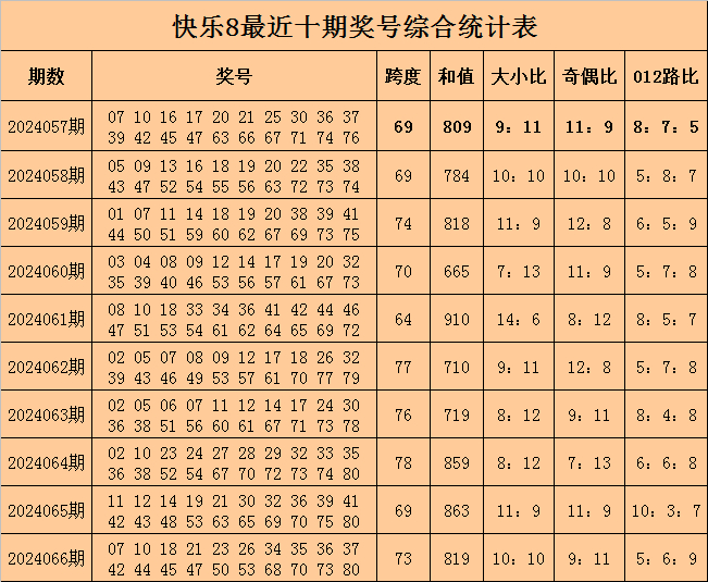 福彩快乐8第2024066期开出奖号:07 10 18 21 23 26 34 35 36 37 42 44 45 47 50 53 68 70 73 80,其中奖号跨度开出73,和值开出819,大小比开出10:10,奇偶比开出9:11,012路比开出5:6:9。