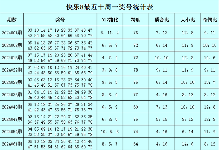 福彩快乐8第2024061期(上周一)开奖回顾:08 10 18 33 34 36 41 42 44 46 47 51 53 54 61 62 64 65 69 72,其中奖号012路比为8:5:7,跨度为64,质合比为4:16,大小比为14:6,奇偶比为8:12。