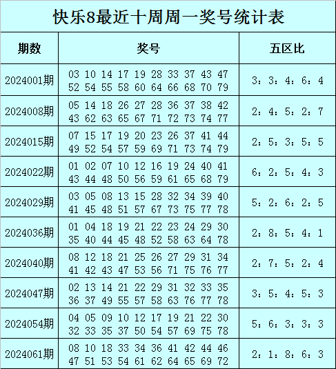 福彩快乐8第2024061期(上周一)开奖回顾:08 10 18 33 34 36 41 42 44 46 47 51 53 54 61 62 64 65 69 72,其中奖号五区比为2:1:8:6:3。