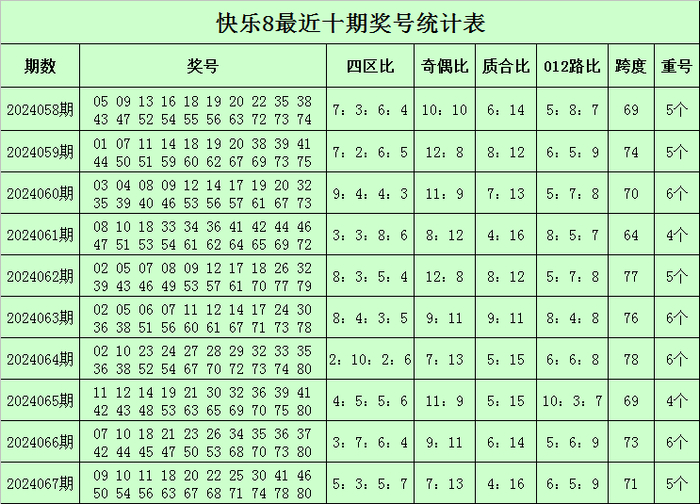 福彩快乐8第2024067期开奖回顾:09 10 11 18 20 22 25 30 41 46 50 54 56 63 67 68 71 74 78 80,其中奖号四区比为5:3:5:7,奇偶比为7:13,质合比为4:16,跨度为71,012路比为6:5:9,开出5个重号:10、18、50、68、80。