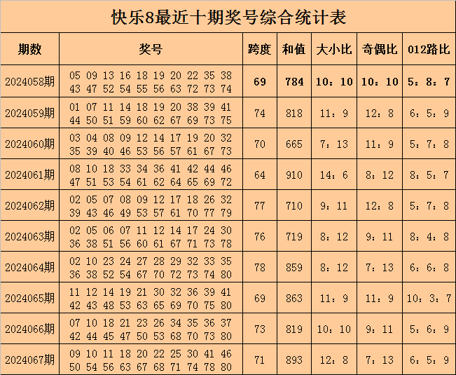 福彩快乐8第2024067期开出奖号:09 10 11 18 20 22 25 30 41 46 50 54 56 63 67 68 71 74 78 80,其中奖号跨度开出71,和值开出893,大小比开出12:8,奇偶比开出7:13,012路比开出6:5:9。