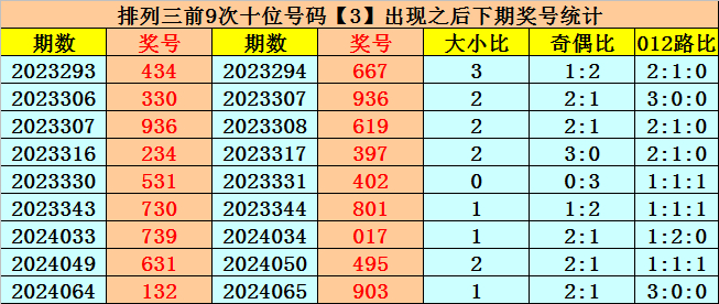 在十位前9次出现号码3后,其下期奖号分别开出:6-3-1-9-0-0-1-9-0,其中奖号个数奇偶比是5:4,大小比是3:6,012路比是7:2:0。