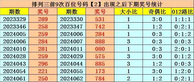 在百位前9次出现号码2之后,下期百位分别开出奖号:5-7-2-8-0-5-8-1-7,其中开出号码个数奇偶比是5:4,大小比是6:3,012路比是1:3:5。