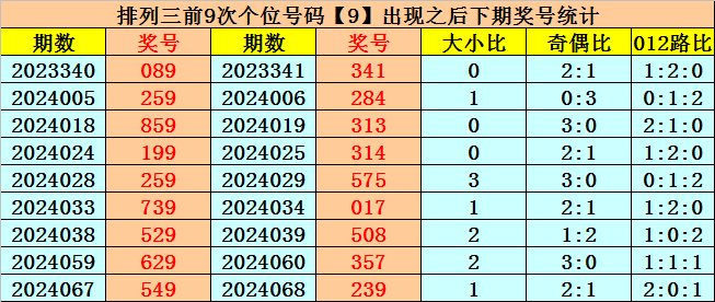 个位号码:上期奖号为大号、奇数、0路号码:9,历史上个位号码9共开出725期,前一次出现在第2024067期,上期奖号为重号。
