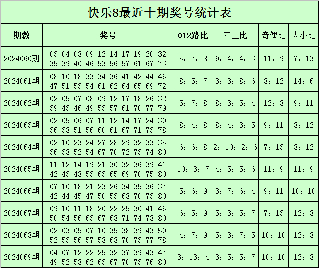 福彩快乐8第2024069期开奖回顾:04 07 12 22 25 32 37 39 43 47 49 52 58 62 63 67 70 73 76 80,其中奖号012路比为3:13:4,四区比为3:5:5:7,奇偶比为10:10,大小比为12:8。