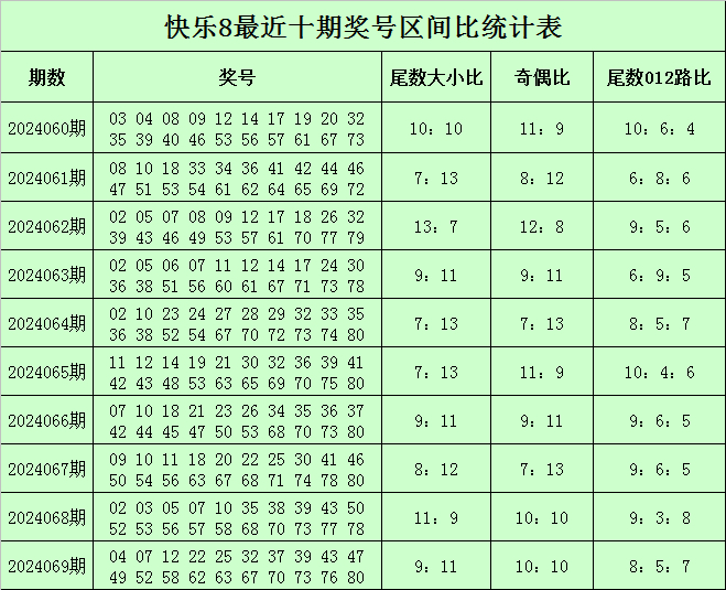 福彩快乐8第2024069期开奖回顾:04 07 12 22 25 32 37 39 43 47 49 52 58 62 63 67 70 73 76 80,其中奖号尾数奇偶比为10:10,尾数大小比为9:11,尾数012路比为8:5:7。