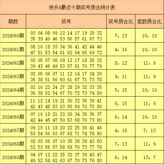 福彩快乐8第2024069期开出奖号:04 07 12 22 25 32 37 39 43 47 49 52 58 62 63 67 70 73 76 80,其中奖号质合比为6:14,奖号尾数质合比为13:7。