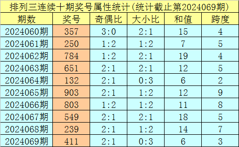 上期回顾:排列三第2024069期奖号:411。类型:组三,奇偶形态:偶奇奇,大小形态:小小小,和值:6,跨度:3。