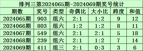 上期回顾:排列三第2024069期开奖号码为411。奖号类型为组三,奇偶比为2:1,大小比为0:3,跨度为3,和值为6。