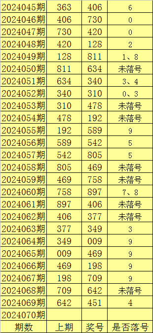 福彩3D第2024069奖号451,重号落号。在最近100期(第2023321期-2024069期)中,重号落号59期;最近20期重号落号概率为60%;最近10期重号落号概率为70%。本期预计重号可能落号。