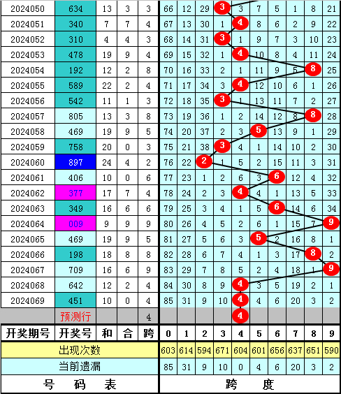 福彩3D第2024069期最大跨度开出4,近期最大跨度波动较大,本期预计最大跨度在1-5区段出现,最大跨度关注12345,重点关注跨度4。