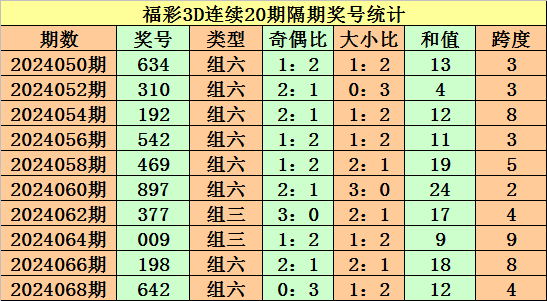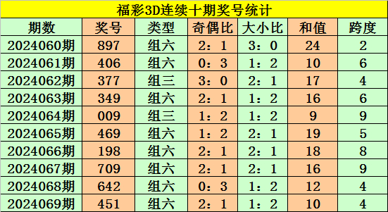上期回顾:福彩3D第2024069期奖号:451。组六、小大小、偶奇奇。