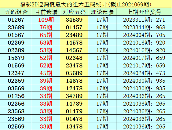 4.截止第24069期,五码组六遗漏最大的是:01267,当前遗漏109期。短期解冻的可能性较小,则24070期奖号分布在01267-34589之中的可能性最大。