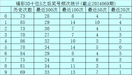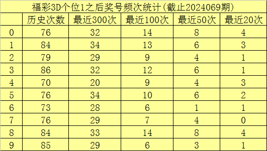 个位杀号:上期个位奖号为1,历史上个位奖号1共开出790次,最近100次个位奖号1出现时,其下期号码0-9开出次数分别为:奖号8、0开出14次,1开出13次,3开出12次,5开出10次,2、4开出9次,7开出7次,6、9开出6次。