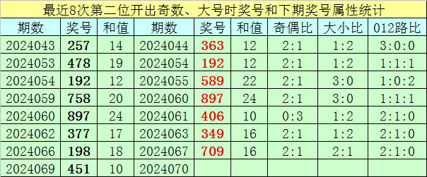 在其下期开奖中,分别开出号码:363、192、589、897、406、349、709,其中号码奇偶总比例为12:9,奇偶号码走势相当;