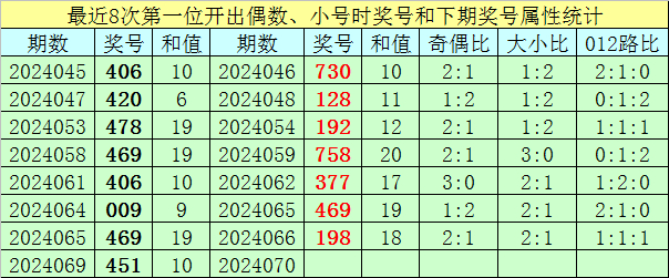 前7次第一位号码开出偶数、小号时奖号分别为:406、420、478、469、406、009、469,其中奇偶总比例为4:17,每期奖号奇偶比与上期奖号奇偶比都不相等;号码大小总比例为9:12,有3期奖号大小比与上期大小比相同;