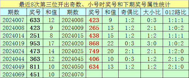 前7次第三位号码开出奇数、小号时奖号分别为:633、423、251、953、473、363、811,其中奇偶总比例为14:7,有5期奇偶比与上期奇偶比相同;号码大小总比例为7:14,有5期奖号大小比与上期大小比相同;
