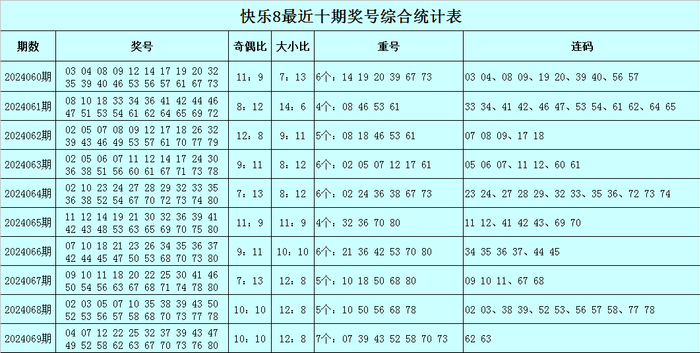 福彩快乐8第2024069期开出奖号:04 07 12 22 25 32 37 39 43 47 49 52 58 62 63 67 70 73 76 80,其中奖号奇偶比为10:10,大小比为12:8,包含7个重号07、39、43、52、58、70、73,包含连码62 63。