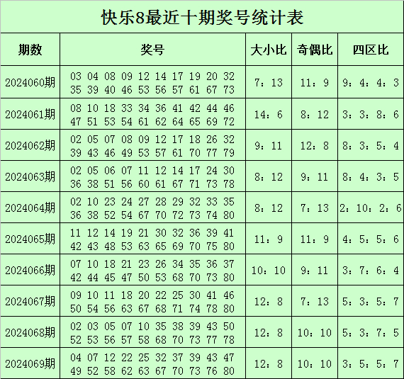 福彩快乐8第2024069期开奖回顾:04 07 12 22 25 32 37 39 43 47 49 52 58 62 63 67 70 73 76 80,其中奖号四区比为3:5:5:7,奇偶比为10:10,大小比为12:8。