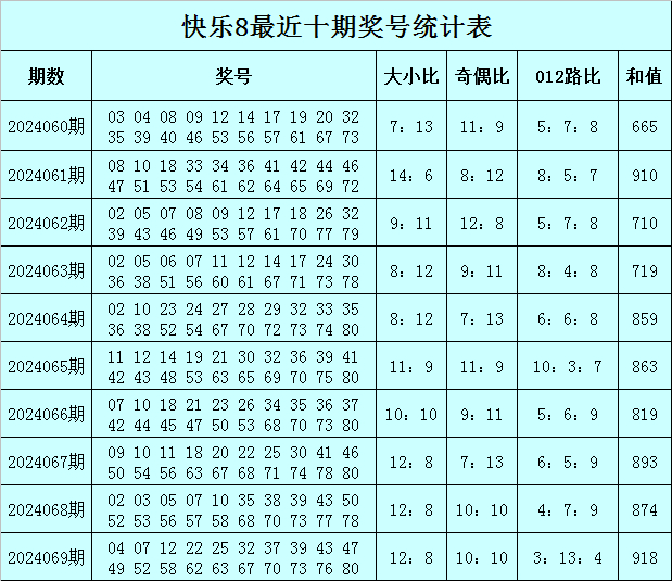 福彩快乐8第2024069期开奖回顾:04 07 12 22 25 32 37 39 43 47 49 52 58 62 63 67 70 73 76 80,其中奖号奇偶比开出10:10,大小比开出12:8,012路比开出3:13:4,和值为918,跨度为76。